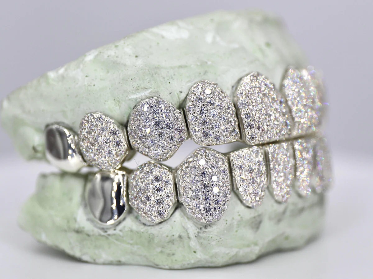 Custom Grillz Hand Set Moissanite Diamonds Top OR Bottom. These stunning pieces are a true work of art, featuring Moissanite diamonds of the finest quality and hand-set with the utmost attention to detail.