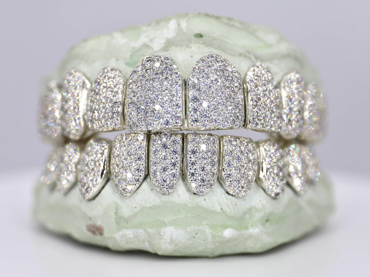 Custom Grillz Hand Set Moissanite Diamonds Top OR Bottom. These stunning pieces are a true work of art, featuring Moissanite diamonds of the finest quality and hand-set with the utmost attention to detail.